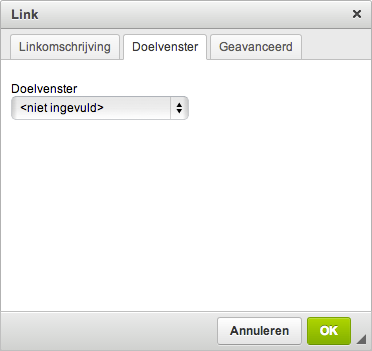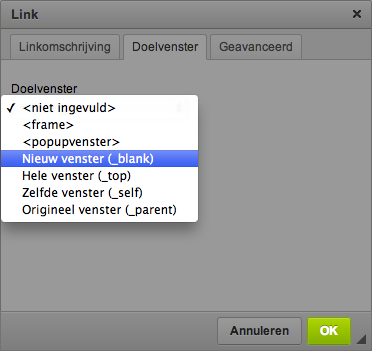 U dient hier als doel “Nieuw venster (_blank)" te selecteren. U klikt vervolgens op “OK” onderaan het venster. De link naar een andere website is nu gemaakt.