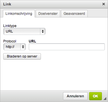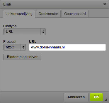 U dient bij “URL” de link naar de betreffende pagina in te vullen.