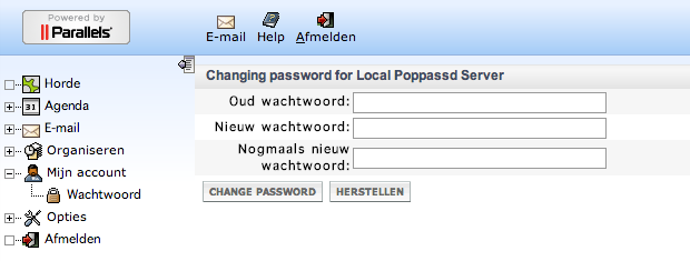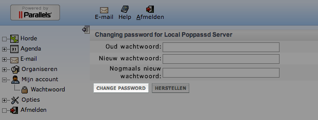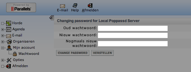 Vul uw huidige wachtwoord in bij "Oud wachtwoord" en uw nieuwe wachtwoord bij "Nieuw wachtwoord". Herhaal uw nieuwe wachtwoord bij "Nogmaals nieuw wachtwoord".