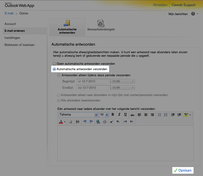 Hieronder kiest u voor 'Automatische antwoorden verzenden' om het bericht in te stellen wat u wenst te versturen naar de personen die u een e-mailbericht versturen op de momenten dat u niet aanwezig bent. Zodra u alles heeft ingevoerd klikt u op de knop 'Opslaan'.
